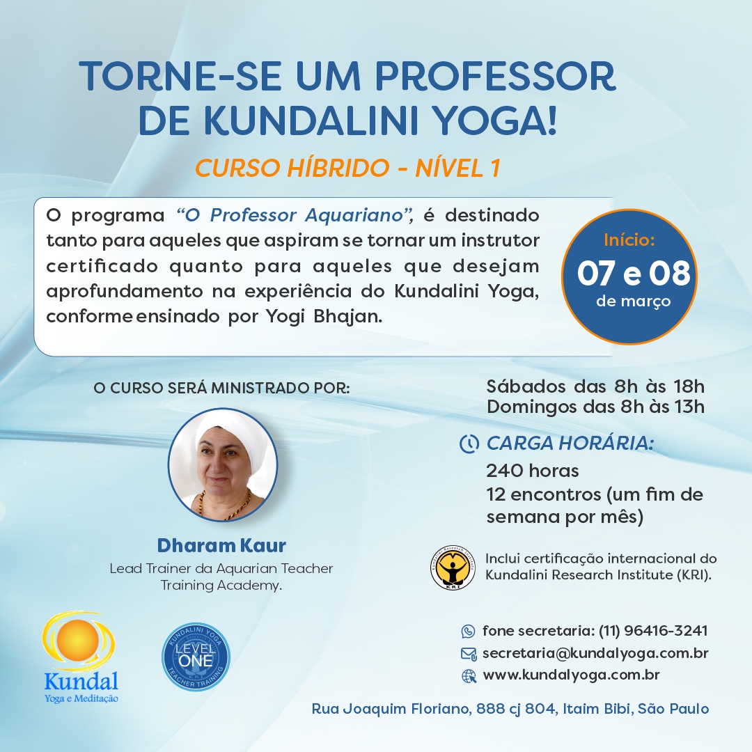 O programa de treinamento de professores de Kundalini Yoga de nível um é a sua introdução aos fundamentos do Kundalini Yoga e ao estilo de vida yogi. Você aprenderá e vivenciará esta tecnologia antiga e poderosa que pode trazer equilíbrio interior e elevar a experiência humana, despertando seu verdadeiro potencial.